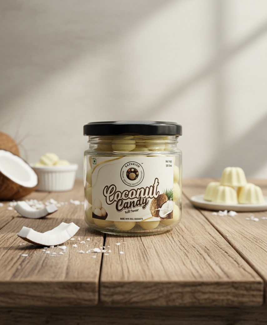 Indulge in the tropical goodness of Satkrish Coconut Candy — crafted with real coconut for pure flavor and silky smooth texture. Each candy is a soft, creamy bite of sweetness that brings the warmth of homemade coconut treats to your jar. Ideal for festivals, gifting, or simply enjoying a premium, natural candy.